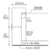 | 素材 | フレーム:樹脂、バックボード:MDF3mm厚、透明板:アクリル、底板:コルクと荒い麻地 | |