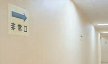 避難誘導は壁面にも表示をしてください。避難時に壁面づたいに歩く人からの視認性がよく、一定の間隔で表示があると迷うこともなく安心です。