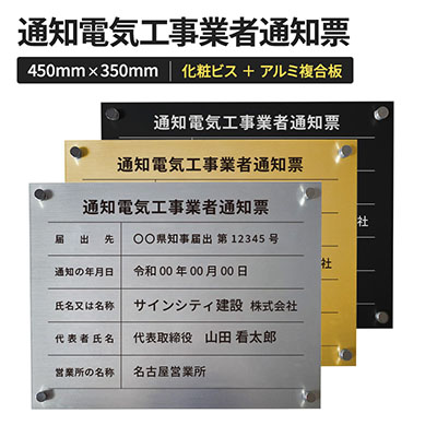 【壁面看板】通知電気工事業者通知票 ステンレス調 化粧ビス付き W450×H350mm 商品詳細 | 看板の激安通販ならサインシティ