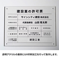 透明アクリルの裏側にUV印刷をして製作しており、正面にはアクリルの光沢が出るため、スタイリッシュな印象を与えます。