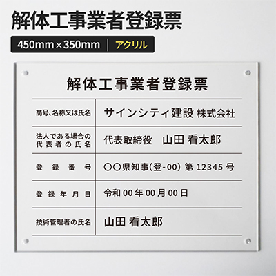 【壁面看板】解体工事業者登録票 アクリル 透明 W450×H350mm 商品詳細 | 看板の激安通販ならサインシティ