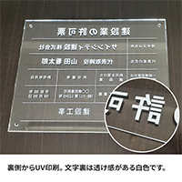 透明アクリルの裏側にUV印刷をして製作しており、正面にはアクリルの光沢が出るため、スタイリッシュな印象を与えます。